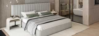 Envelop yourself in the quiet luxury of this calm and luxurious bedroom, filled with minimal silhouettes in opulent materials.
