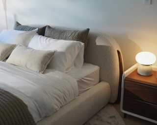 Like a beacon in the night, the Nino Table Lamp will guide you with its ambient glow and rounded silhouette. The soft tones of the white terrazzo and the frosted glass globe unite to create an atmosphere of serenity in any space. Also available in a floor lamp version here.